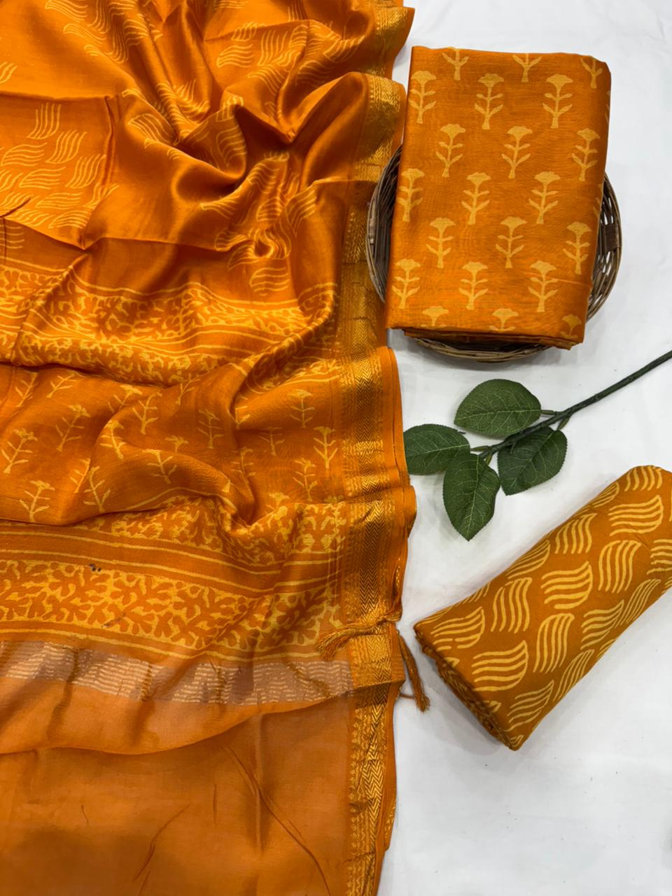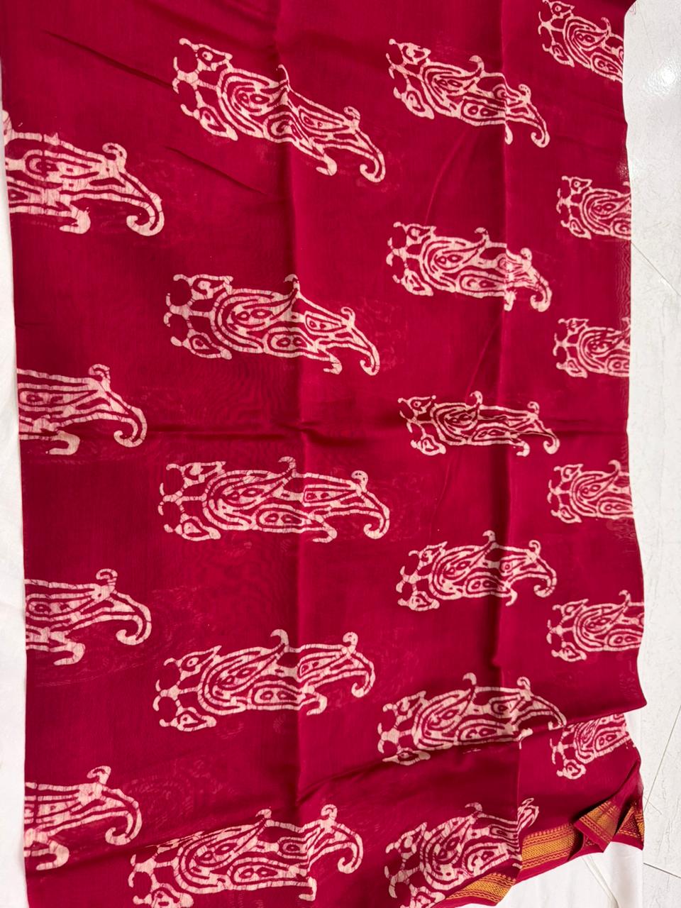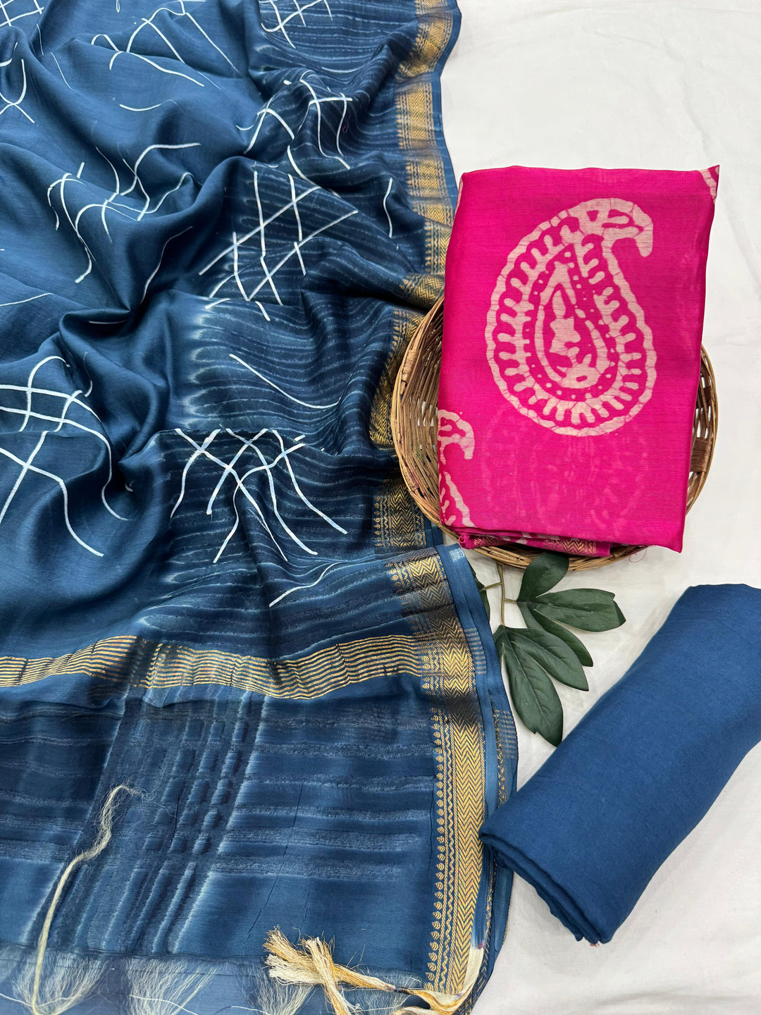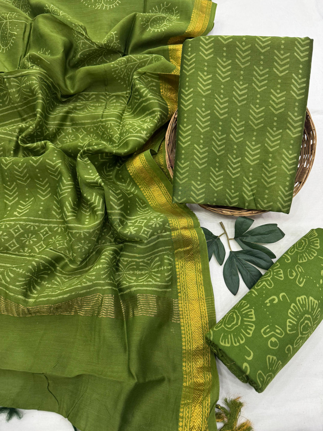 Hand Block Printed Maheshwari Silk Suit with Maheshwari Silk Dupatta.