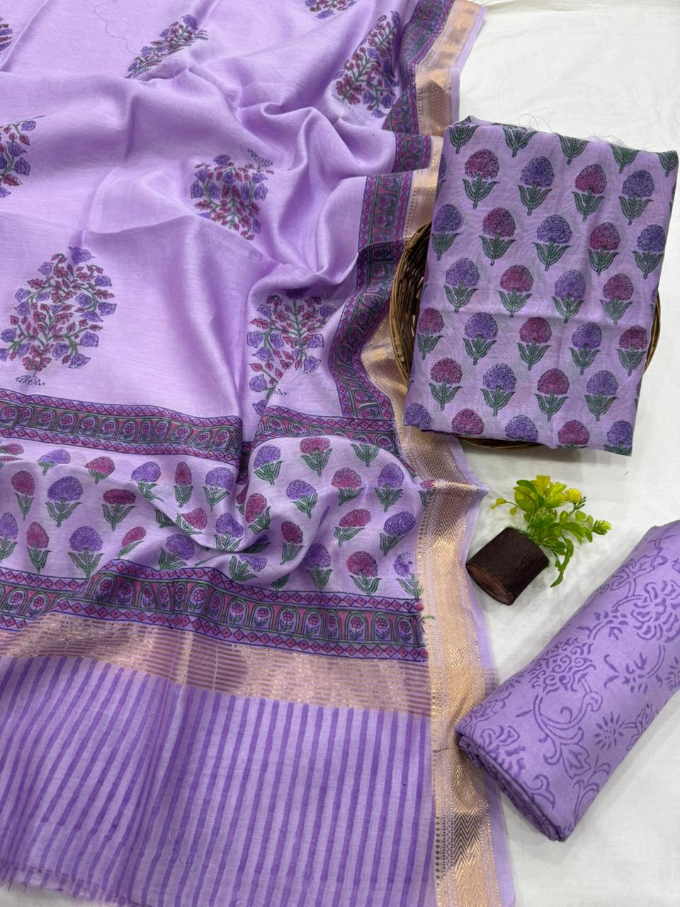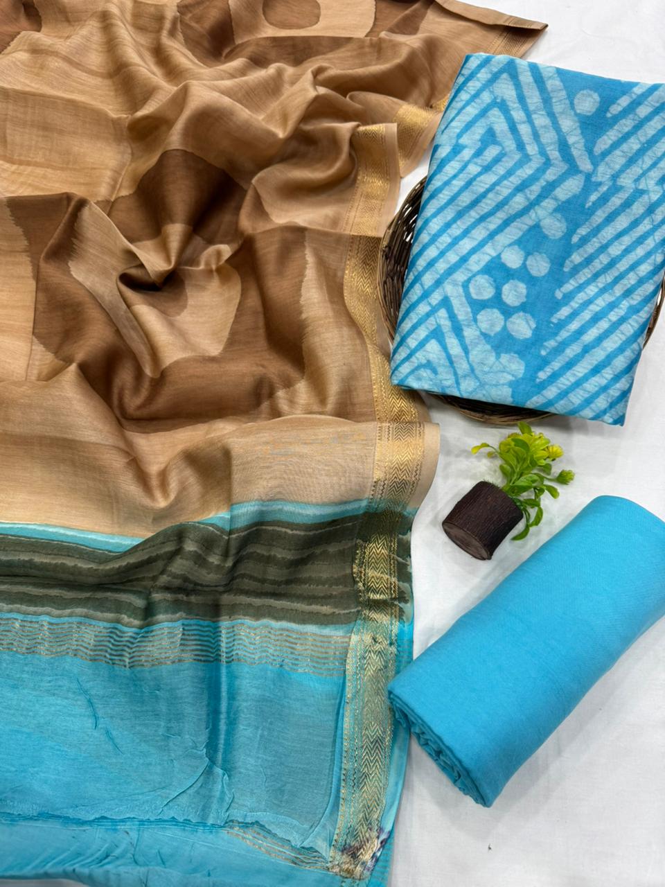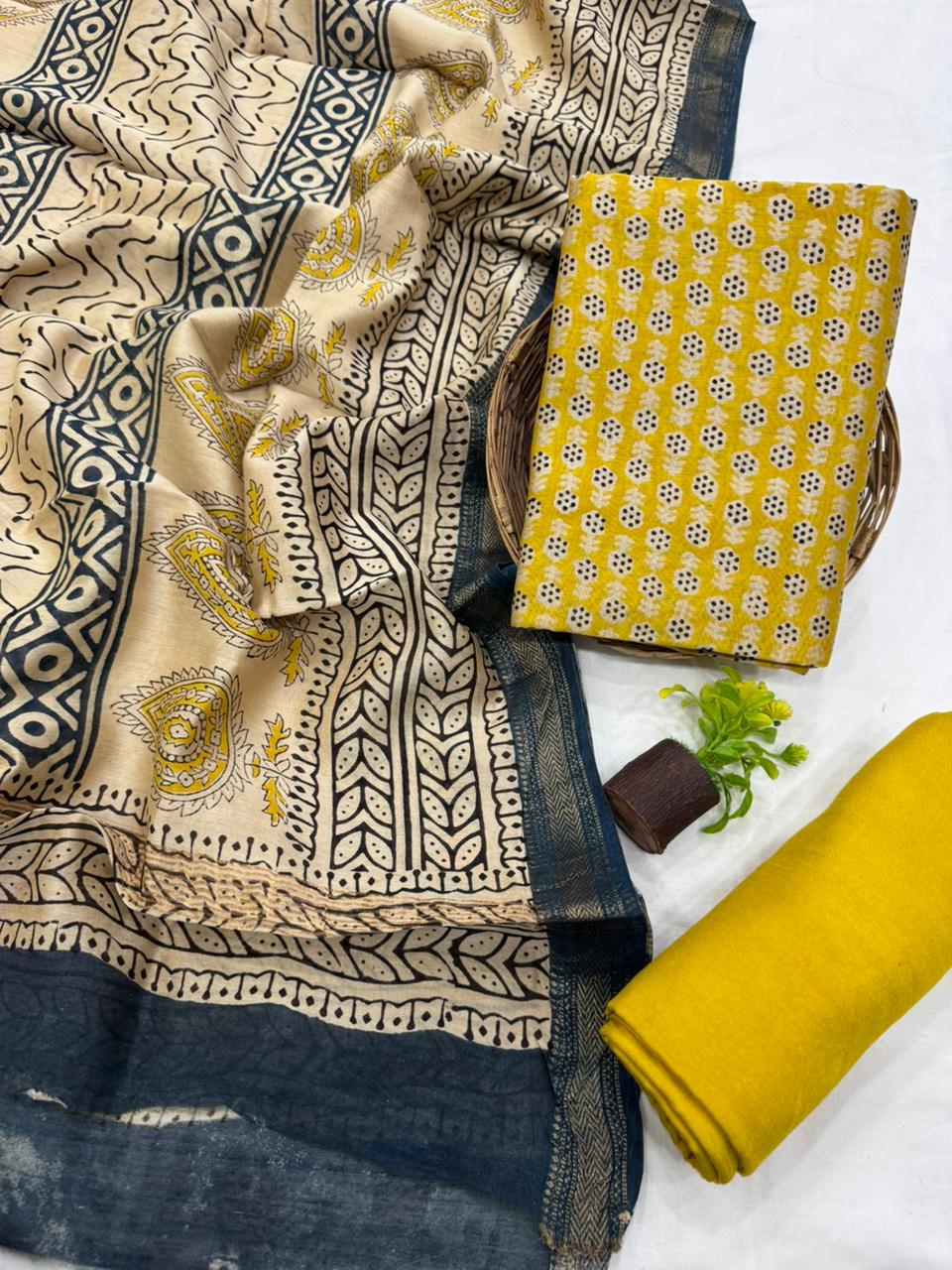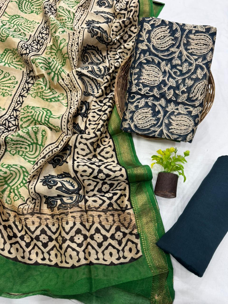 Hand Block Bagru Printed Maheshwari Border Silk Suit Set.