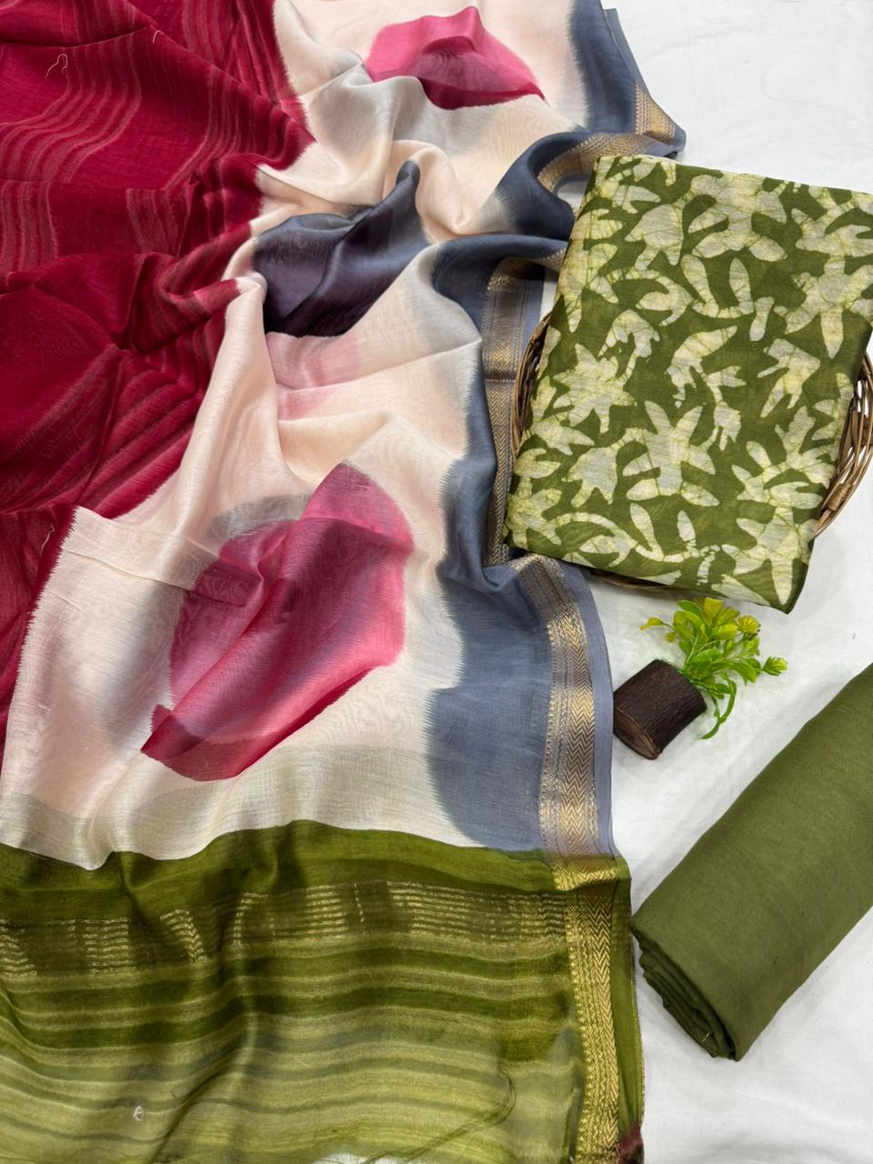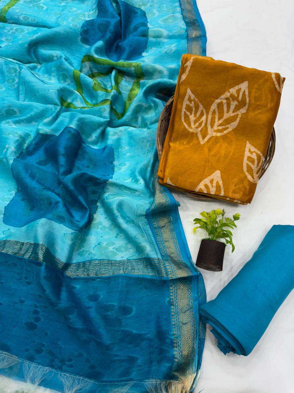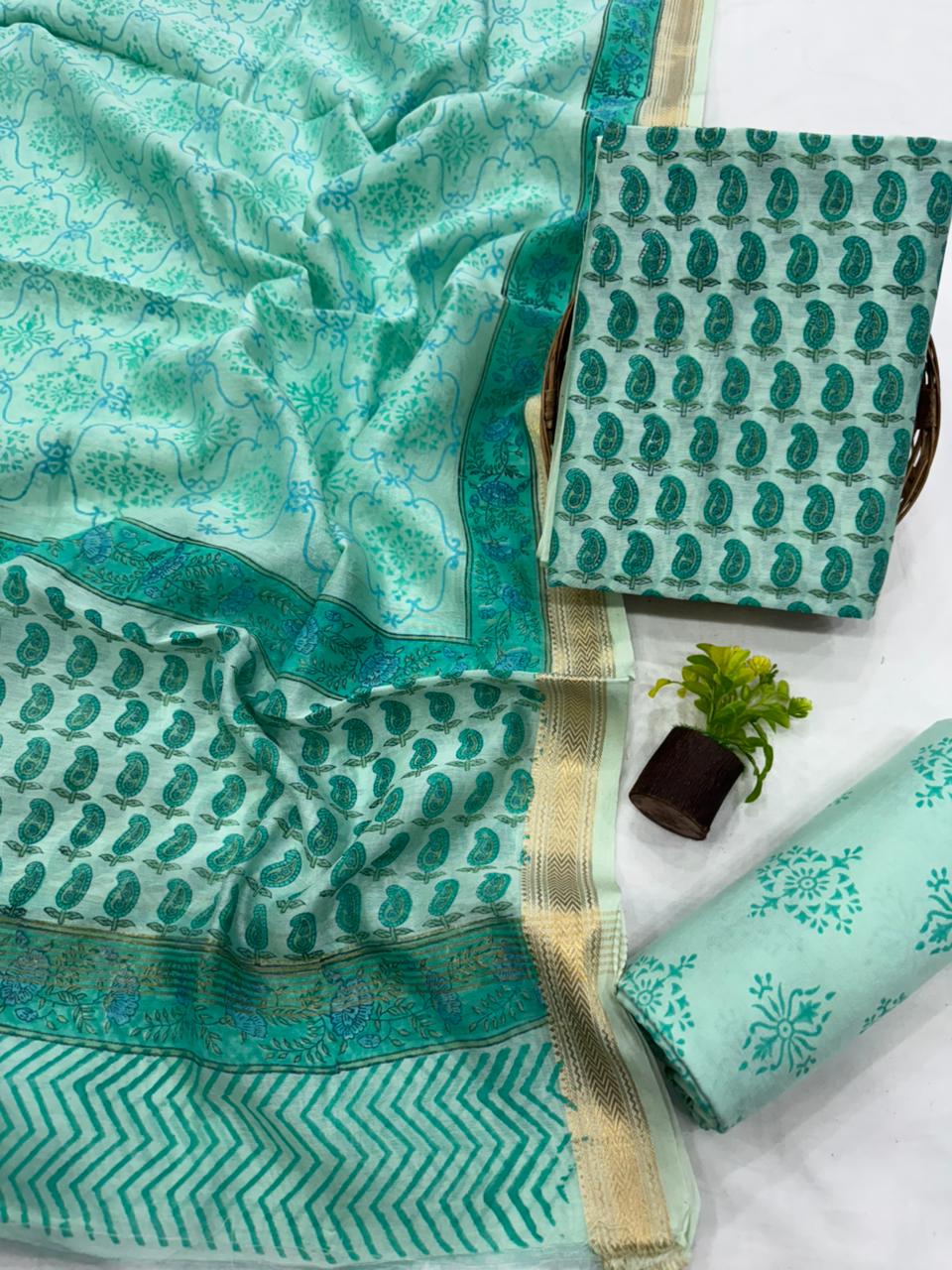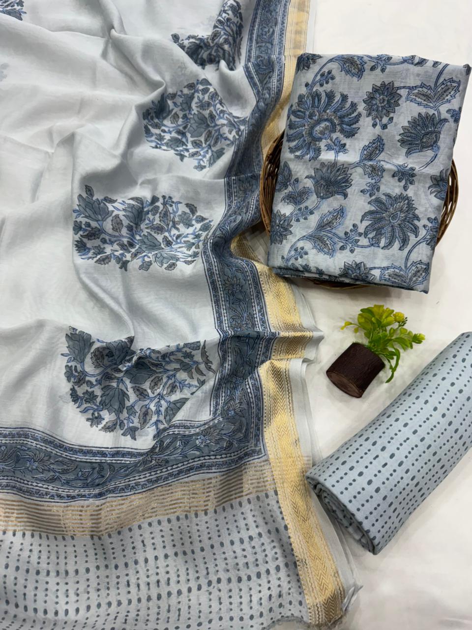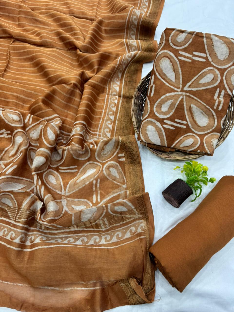 Hand Block Bagru Printed Maheshwari Border Silk Suit Set.