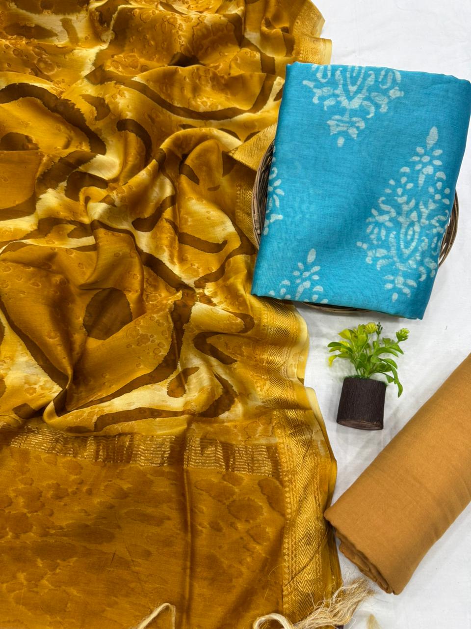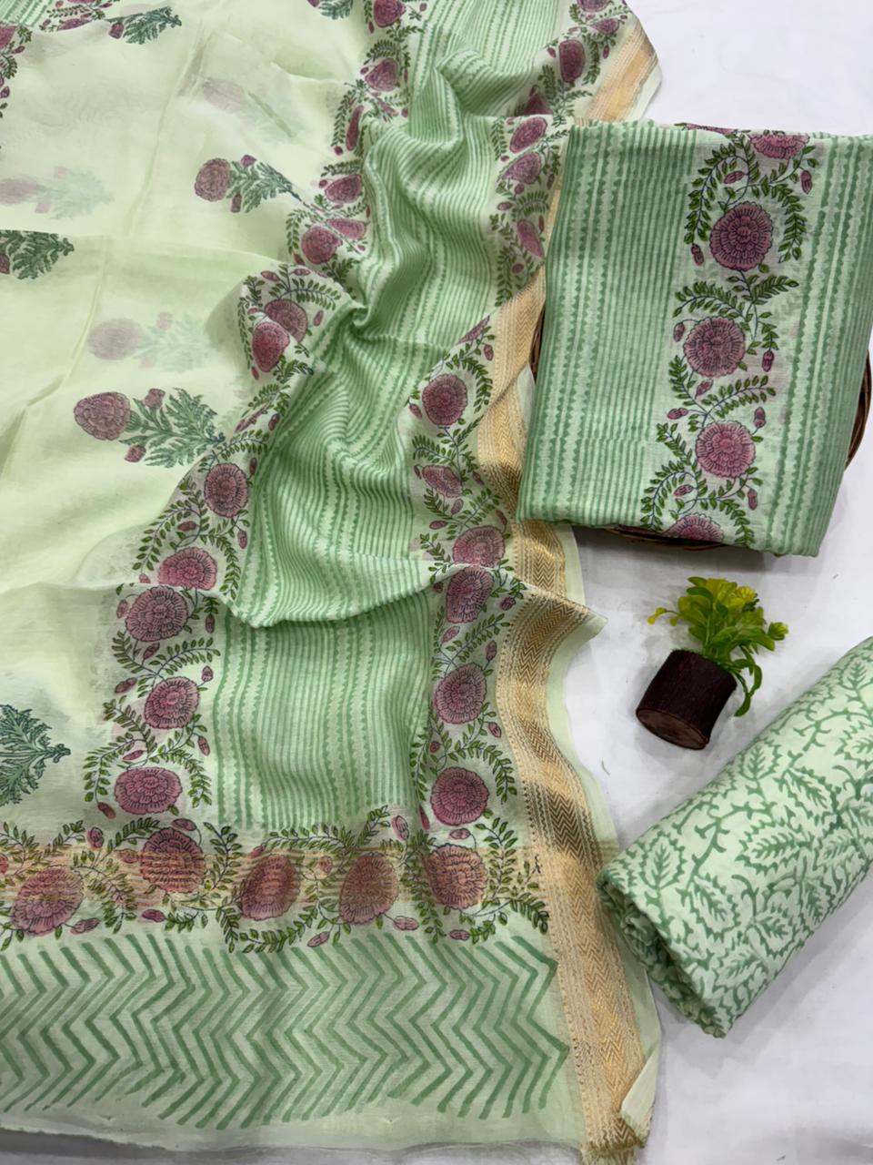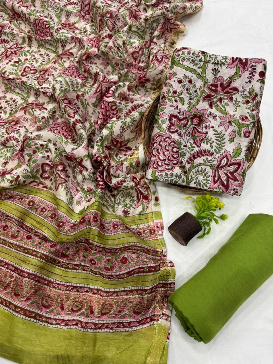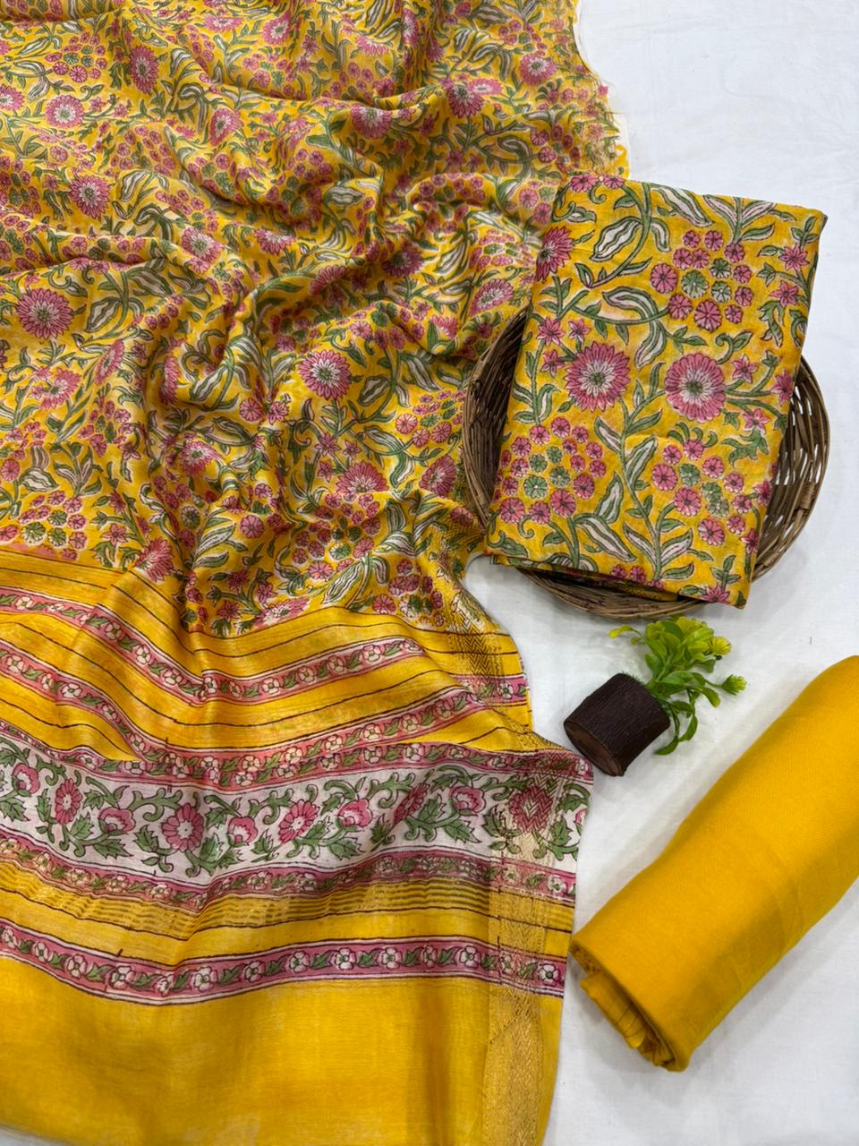 Hand Block Bagru Printed Maheshwari Border Silk Suit Set.