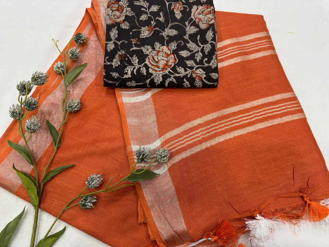 Plain Linen saree With Printed Blouse