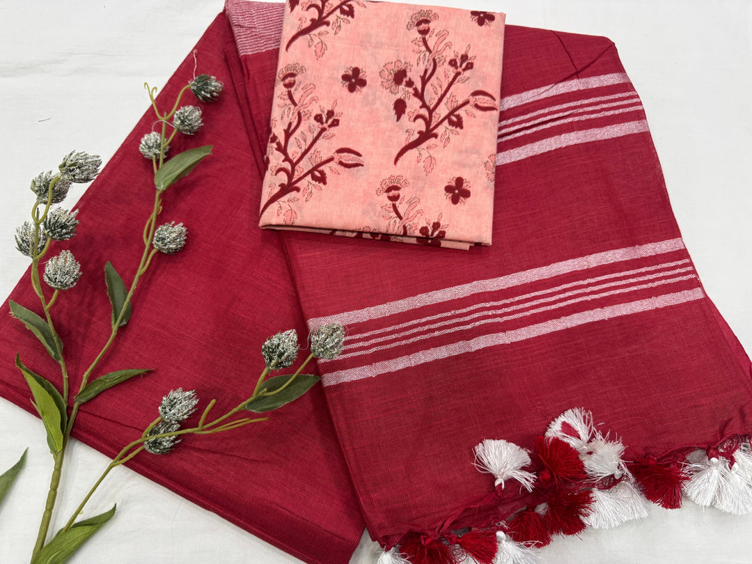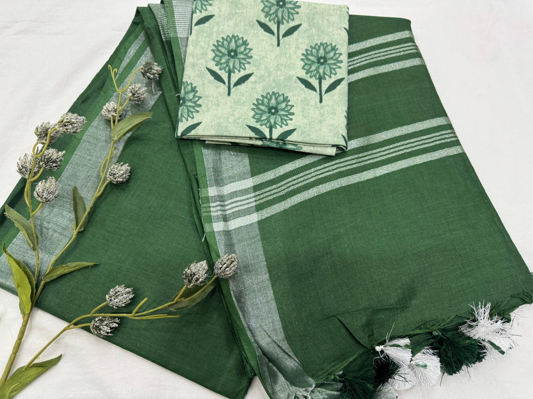 Plain Cotton Linen Saree With Printed Cotton Blouse