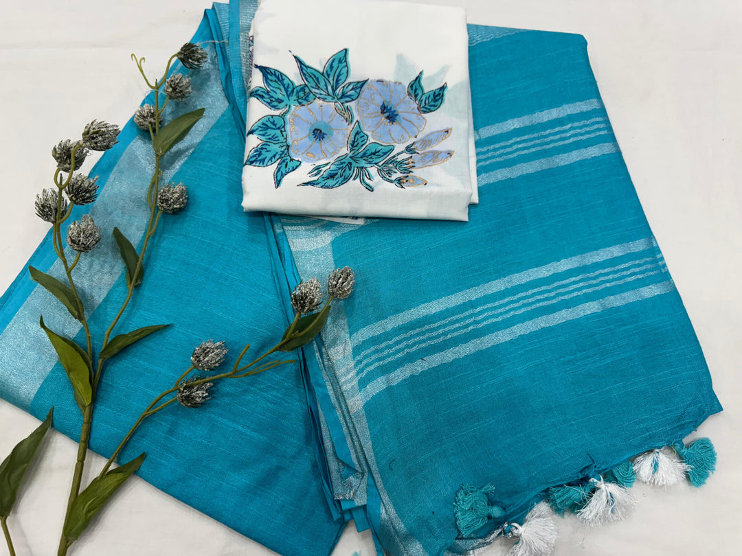 Cotton Linen Saree With Printed Cotton Blouse