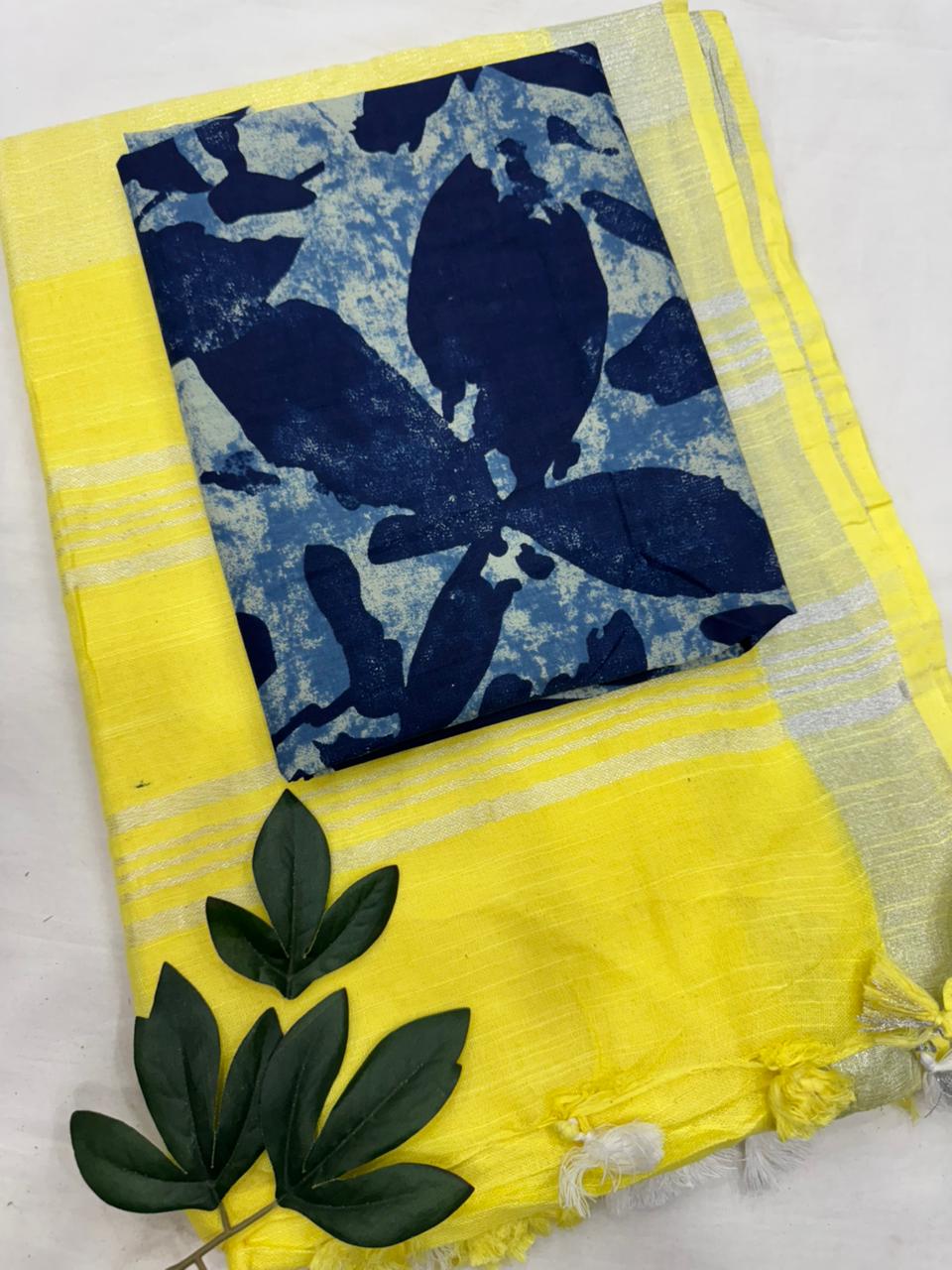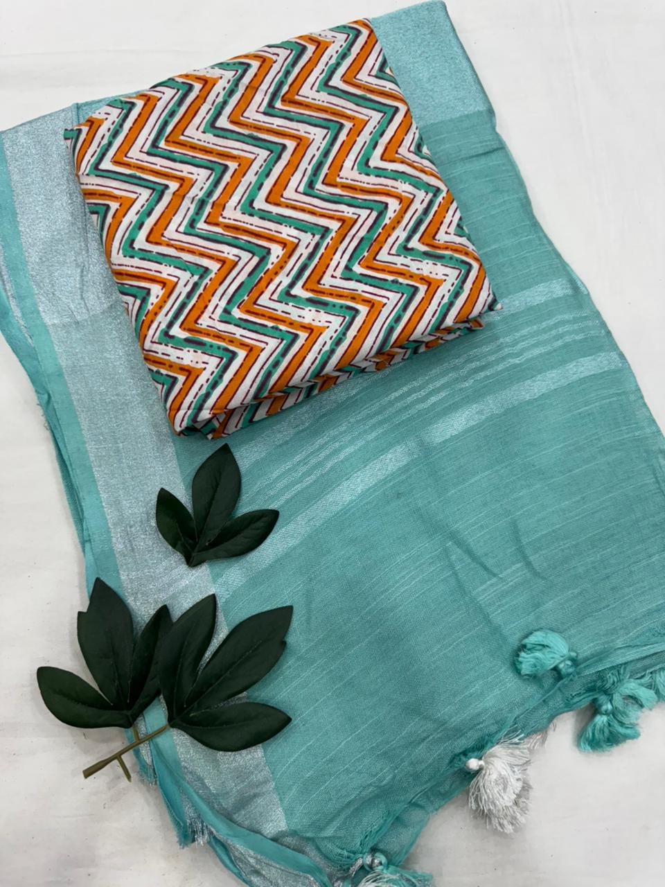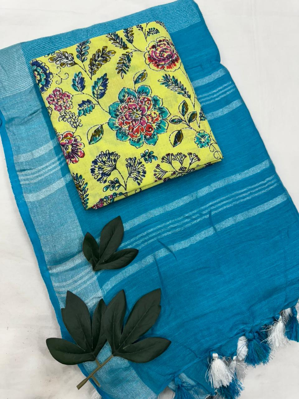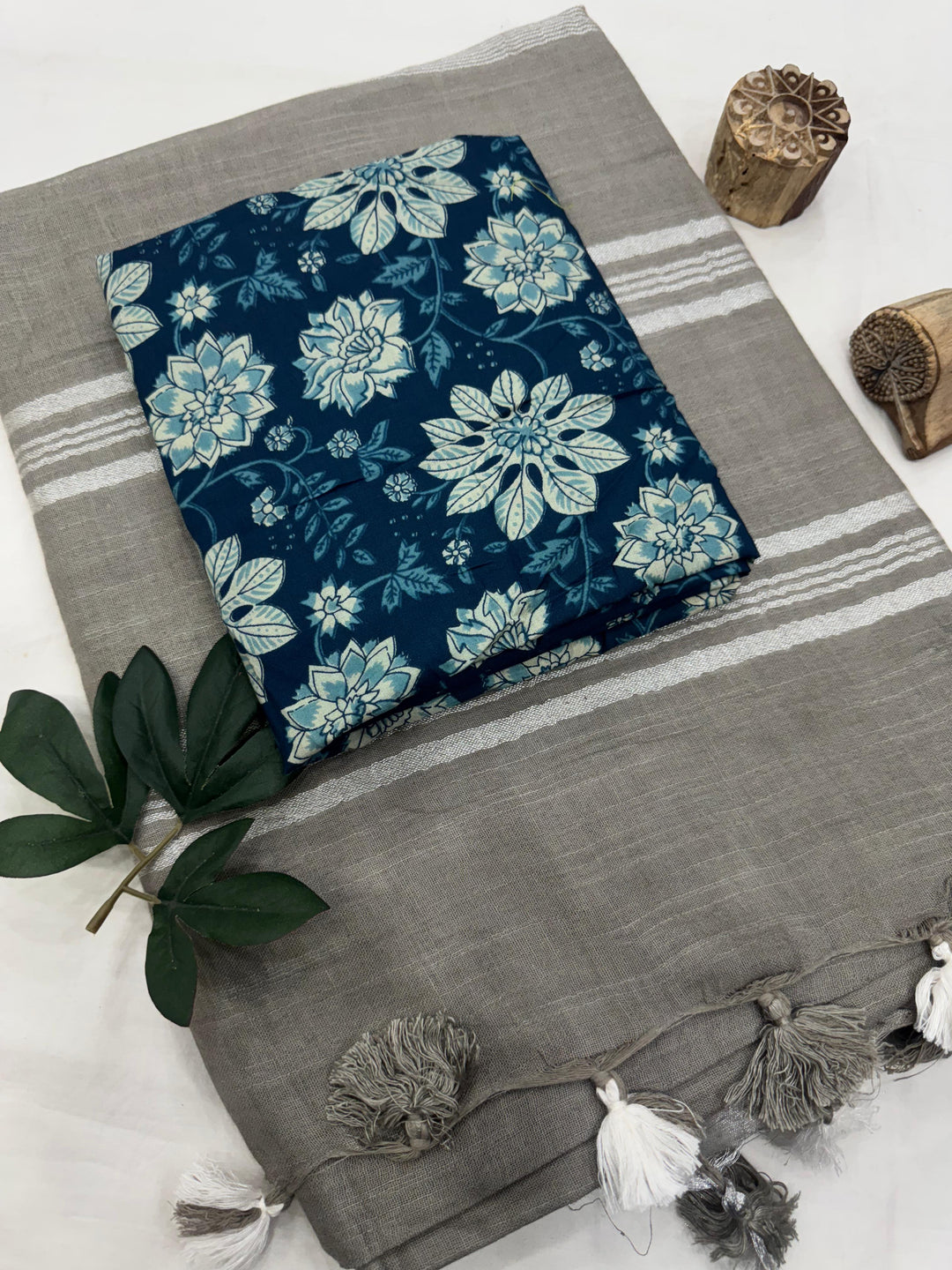 Beautiful Cotton Linen Saree With Printed Cotton Blouse